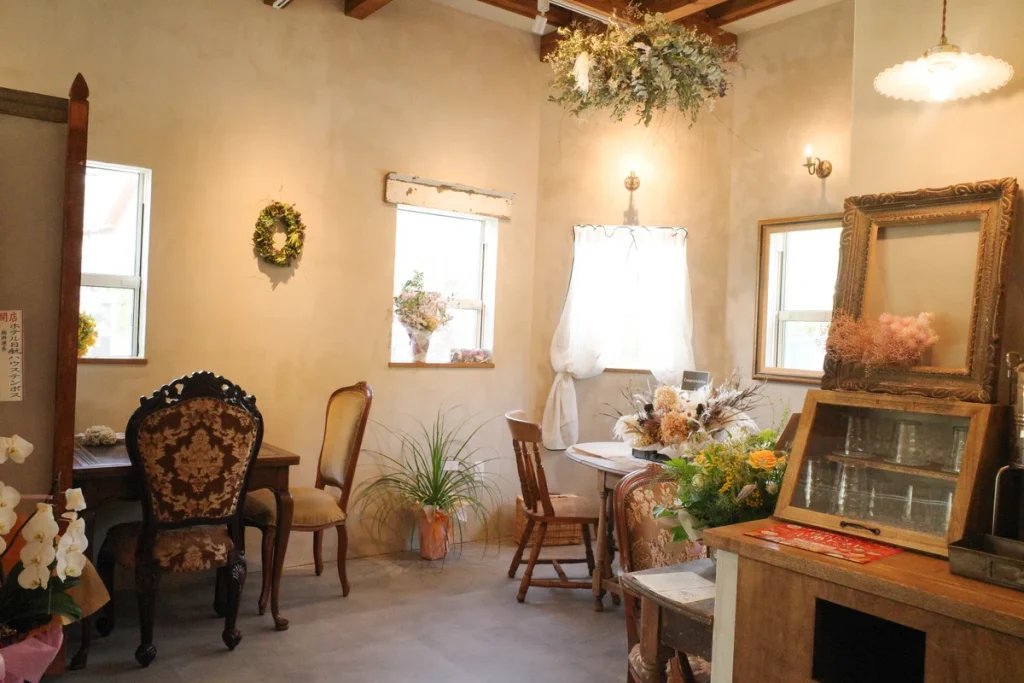 アンティーク家具とドライフラワーに囲まれた店内は、かわいいと落ち着きが両立する空間。