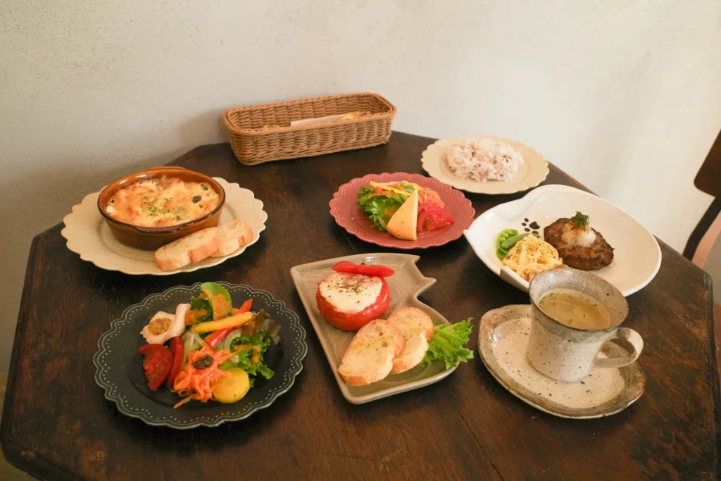 ランチは限定メニューや定番のキッシュプレートから選べ、どれもいろどり鮮やか。